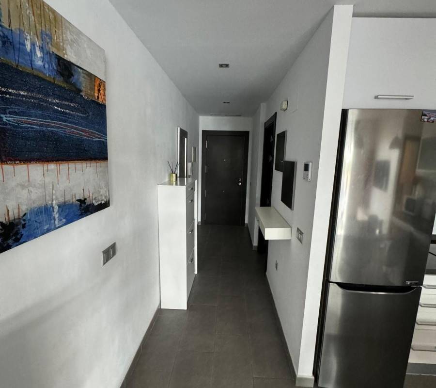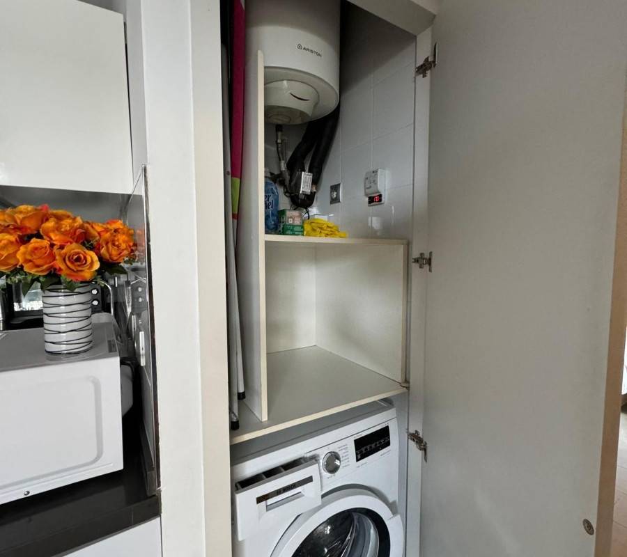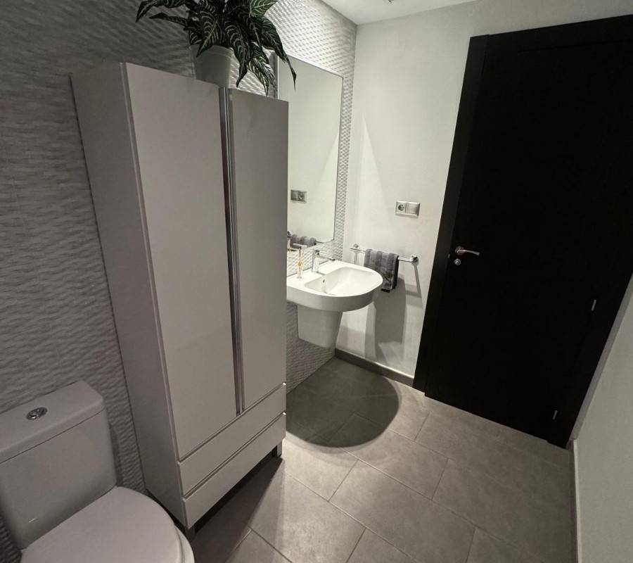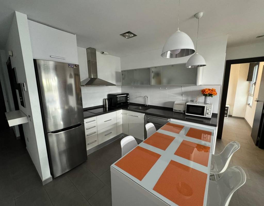 La cocina moderna y funcional, equipada con muebles y electrodomésticos de primera calidad, se integra de forma elegante con el salón-comedor, creando un espacio abierto, cómodo y acogedor. Desde el salón se accede a una amplia terraza privada, perfecta para disfrutar de desayunos al sol, cenas al aire libre o simplemente relajarse durante todo el año gracias al excelente clima mediterráneo.