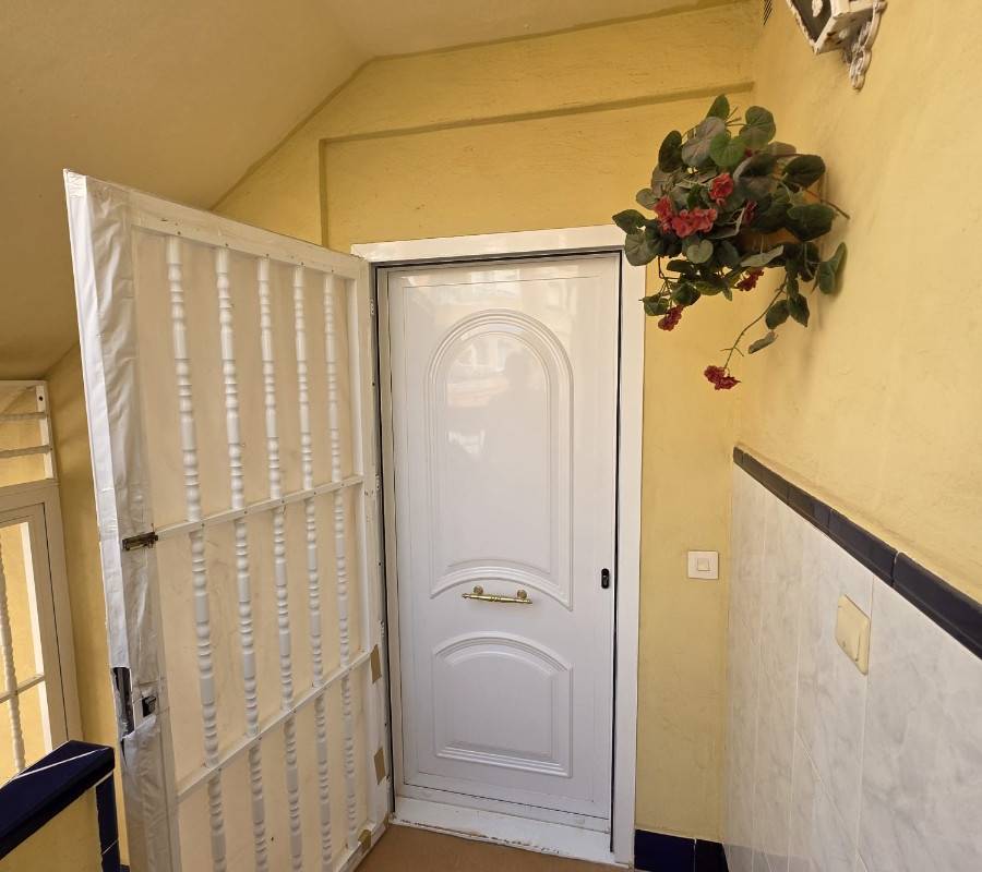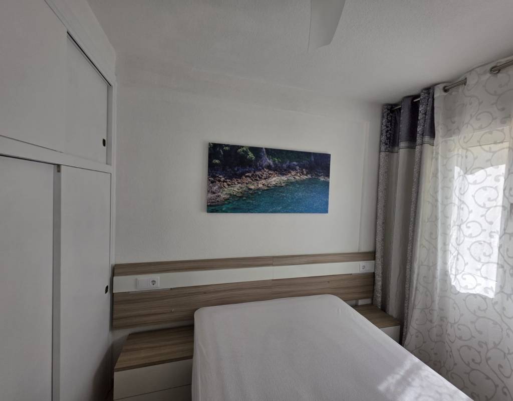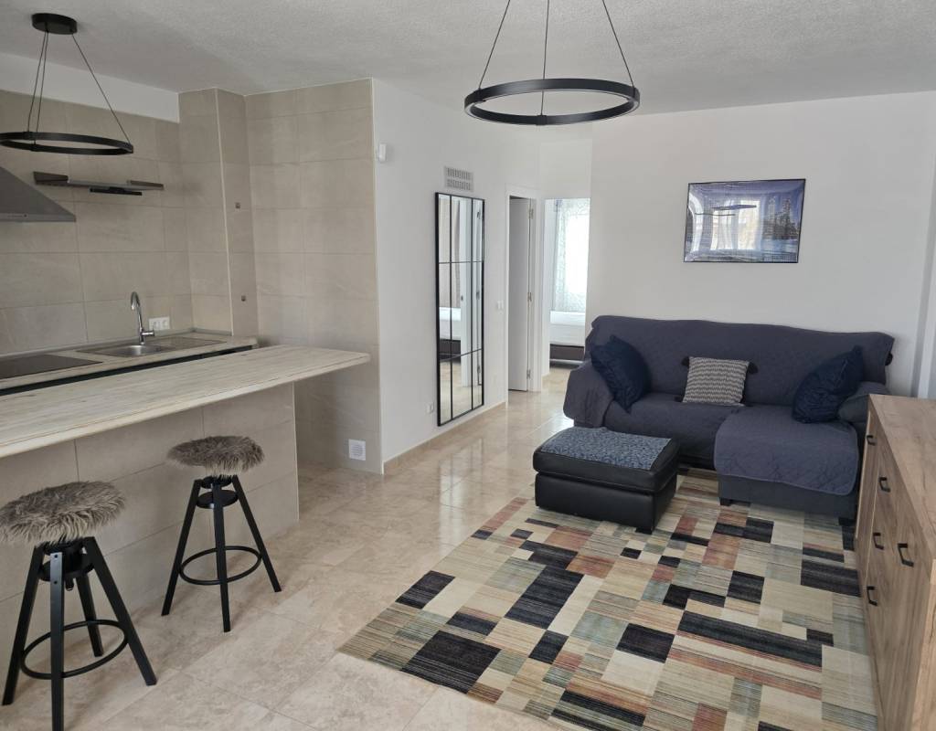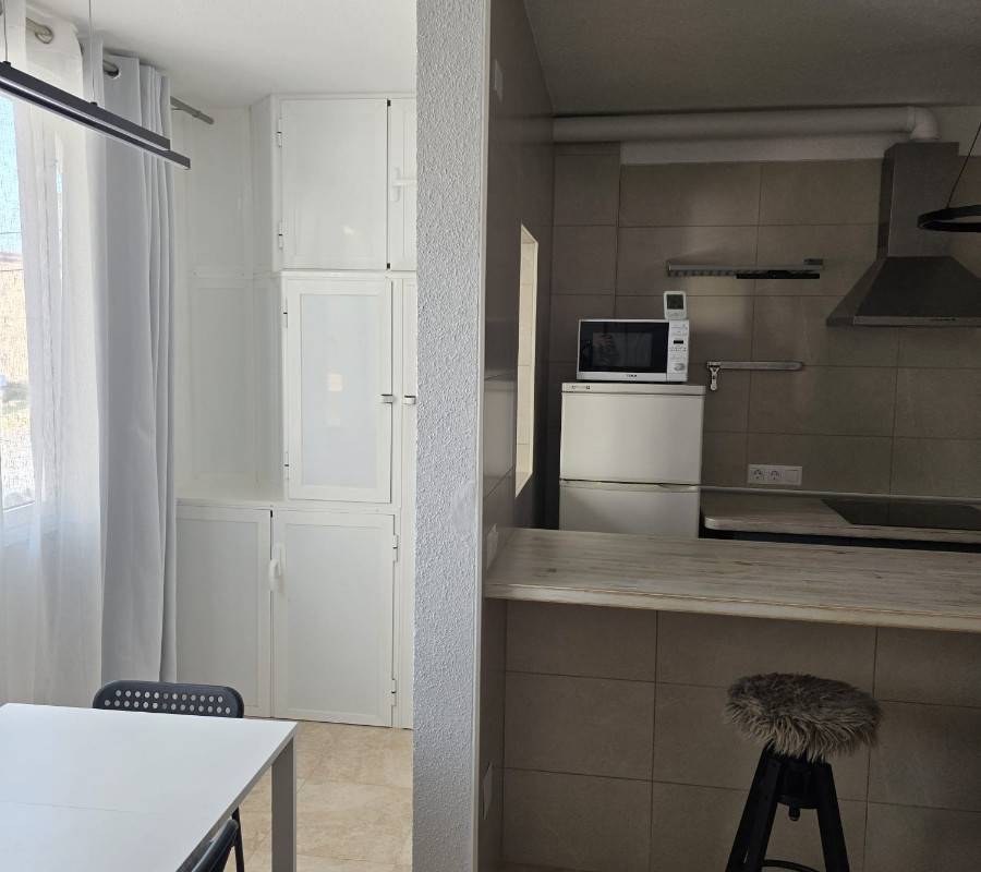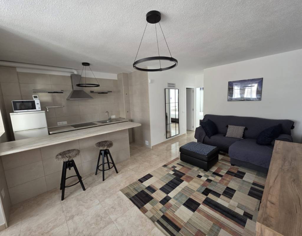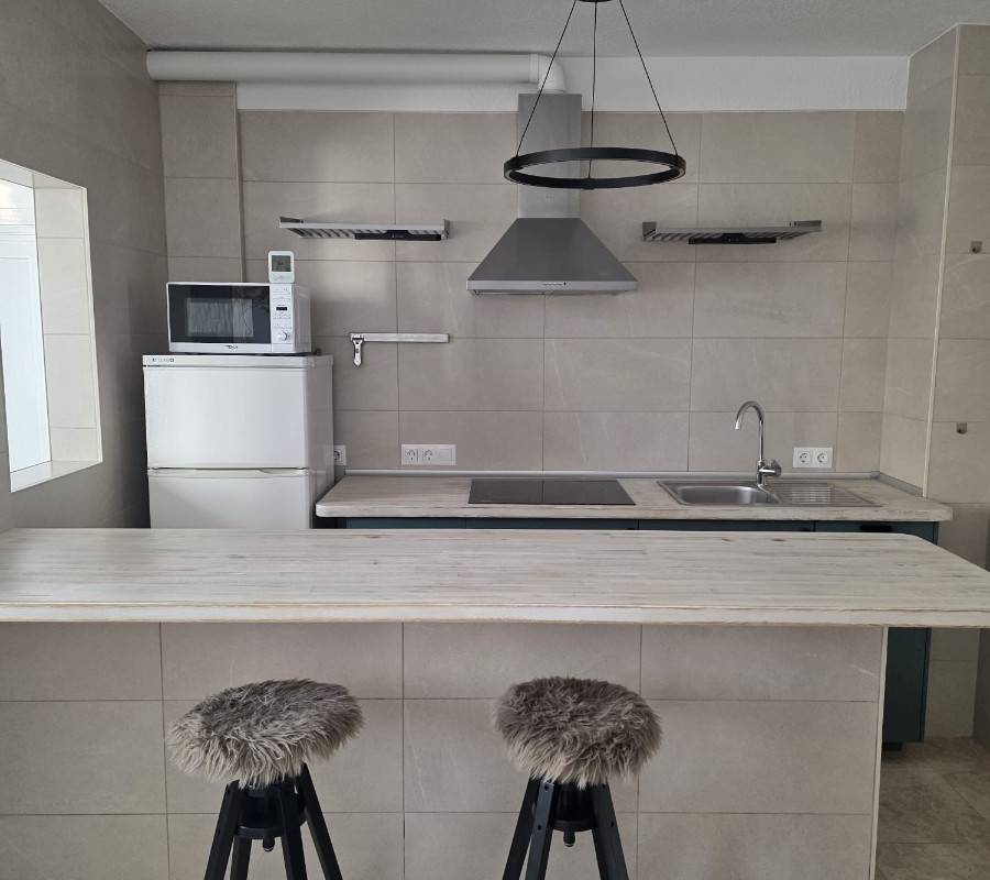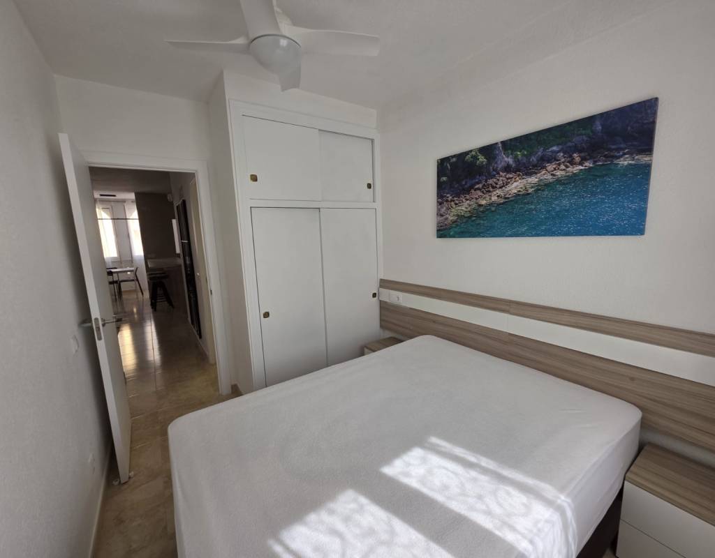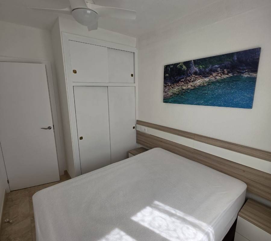 La vivienda dispone de salón con cocina abierta, un baño completo y dos dormitorios con armarios empotrados y ventiladores de techo, ofreciendo comodidad y funcionalidad.